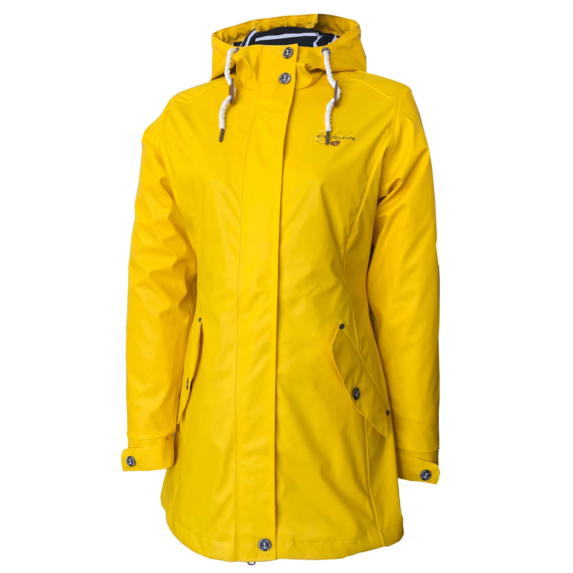 Moderner PU-Damenmantel im Friesennerz-Stil für Boot und Freizeit. Wind- und wasserdicht mit verschweißten Nähten, tailliertem Schnitt, verstellbarer Kapuze, Unterarmbelüftung und verlängertem Rückenteil – ideal für wechselhaftes Wetter an Bord und an Land.
