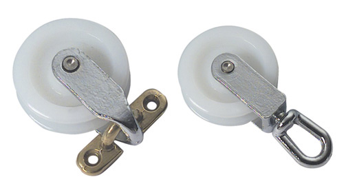 Umlenkrolle für Lenksysteme mit robuster Kunststoffscheibe Ø 50 mm. Geeignet für Drahtseile bis 5 mm und ideal zur zuverlässigen Führung von Steuerseilen. Wahlweise als Einfachblock mit Bügel oder mit Wirbel erhältlich – langlebig, leicht und optimal für den Einsatz an Bord.