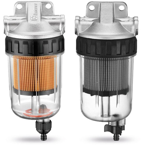 Kompakter Wasserabscheider für sauberen Kraftstofffluss in Benzin- oder Dieselsystemen. Mit Wasserablassschraube zum einfachen Entleeren und abnehmbarem Filter. Geeignet für 10 mm Treibstoffleitungen, Filter-Ø 110 mm, Höhe 190 mm. Durchfluss 205 l/h bei 0,49 PSI.