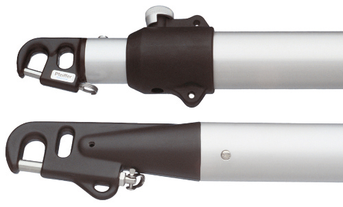 Teleskop-Spibaum aus hochfestem, silber/schwarz eloxiertem Aluminium mit Spibaumbeschlag. Sichere Arretierung per Federbolzen und Bohrungen im 25-cm-Raster für stabile, formschlüssige Verbindung. Ideal für präzises Setzen und Führen des Spinnakers im Segelsport.
