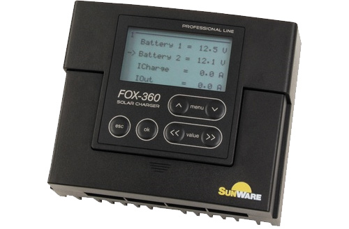 Der FOX 360 Solarladeregler von SunWare steuert zwei Batteriesysteme mit bis zu 20 A Modulstrom. Geeignet für AGM-, GEL- und Blei-Säure-Batterien. Mit PWM-Regelung, optimierter Ladekennlinie, LCD-Anzeige, 12/24 V Erkennung und Temperaturkompensation.