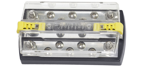 Robuste Doppelsammelschiene mit 5 Verbraucheranschlüssen (10-32 Schrauben) und 2 Zuleitungsanschlüssen (1/4" Schraubbolzen) zur sicheren Stromverteilung an Bord. Passend für Ringkabelschuhe 4 mm und 6 mm. Inklusive transparenter, aufschnappbarer Abdeckung für optimalen Schutz.