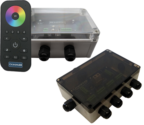 OceanDMX RC von OceanLED: DMX-fähige Funkfernbedienung zur komfortablen Steuerung maritimer Beleuchtungssysteme. 3 programmierbare Szenen, bis zu 10 Modi inkl. Pause-Funktion. IP68-DMX-Empfänger, 20 m Reichweite und 4-Zonen-Steuerung für maximale Lichtkontrolle an Bord.