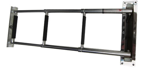 Teleskop-Badeleiter aus poliertem Edelstahl AISI316 zur festen Montage in der Badeplattform. Die stabile Niro-Box ermöglicht ein platzsparendes Versenken der Leiter. Rutschfeste Kunststoffstufen sorgen für sicheren Halt beim Ein- und Aussteigen im Wasser.