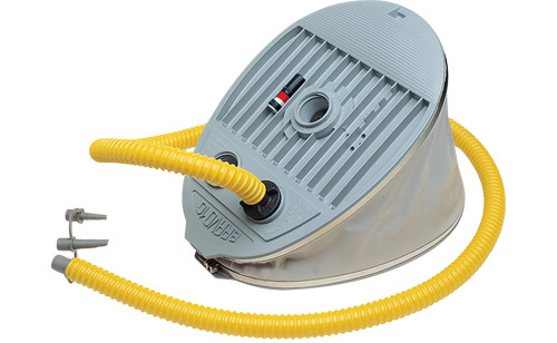Hochwertige Fußpumpe Bravo 10 von Scoprega mit effizientem Zweikammer-System für schnelles und kraftsparendes Aufpumpen von Schlauchbooten, SUPs und aufblasbarem Bootszubehör. Mit Universaladapter für verschiedene Ventile. Förderleistung von 10 Litern pro Hub.
