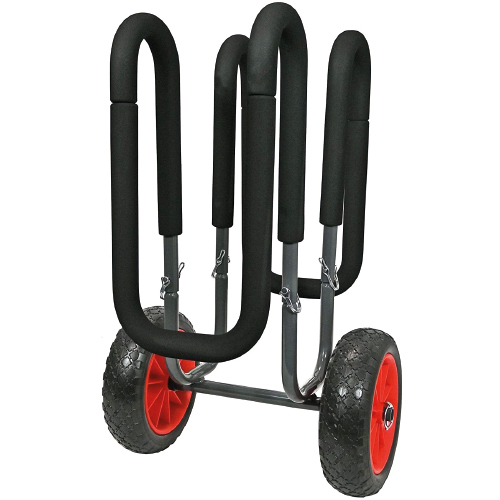 Leichter SUP Transportwagen aus Aluminium für den komfortablen Transport von Stand-Up-Paddle-Boards zum Wasser. Das platzsparend zerlegbare Universalmodell passt für viele SUP-Boards und sorgt mit großen Gummi-Luftreifen für leichtes Rollen über Sand, Steg oder Hafenbereich.