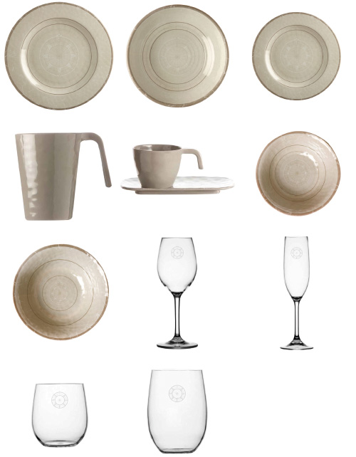 Maritimes Geschirr-Set Bali aus 100 % Melamin mit bruchsicheren Gläsern aus Tritan. Die Teller überzeugen mit dezenter Porzellan-Optik und feinem Relief. Leicht, robust und ideal für Törn, Yacht und Outdoor-Einsatz – stilvoll genießen an Bord oder im Hafen.