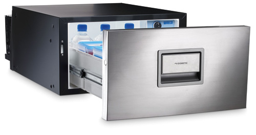 Kompakte 30 L Kühlschublade mit Niro-Türblende für Yacht, Caravan und Bordküche. Leistungsstarker Danfoss BD35F Kompressor mit integrierter Elektronik, Unterspannungsschutz und Verpolungssicherung. Temperatur elektronisch von +12 bis -2 °C regelbar. Für 12/24/230 V geeignet.