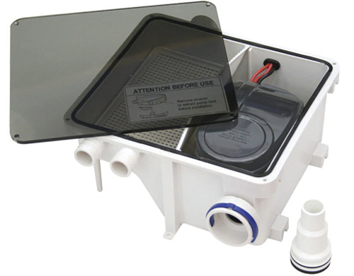 Kompakte Duschabsaugeinheit LSU 600 für Waschbecken und Dusche an Bord. Pumpt Abwasser zuverlässig in den Tank und verhindert Wasserstau dank Rückschlagventil. Mit automatischer Bilgepumpe, Schwimmerschalter und leicht zugänglichem Filter für sichere Entwässerung im Marinebereich.