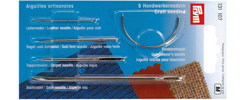 Praktisches 5-teiliges Nadelset von Prym für vielseitige Reparatur- und Handarbeiten an Segeltuch, Planen, Persenning oder robusten Stoffen. Das Set enthält fünf unterschiedliche Handwerkernadeln, darunter eine Halbkreisnadel Ø 40 mm sowie Langnadeln in 45, 56, 61 und 102 mm Länge.